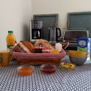 Nous vous proposons tout le nécessaire du petit déjeuner qui sera disponible à votre arrivée dans le gîte (brioche, cake, biscottes, jus d’orange, lait, café, chocolat, thé, beurre, confiture)
